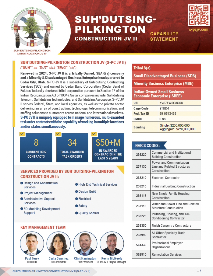 Suh’dutsing-Pilkington Construction JV II (S-PC JV II), est. in 2024, is a Tribally Owned, SBA 8(a) company and a Minority & Disadvantaged Business Enterprise headquartered in Cedar City, Utah. S-PC JV II is a subsidiary to Suh’dutsing Contracting Services (SCS). SCS as part of a family of companies wholly owned by Cedar Band Corporation, which is the Cedar Band of Paiutes’ federally chartered tribal corporation (pursuant to Section 17 of the Indian Reorganization Act of 1934) – including the following sister companies: Suh’dutsing Telecom, Suh’dutsing Technologies, and Suh’dutsing Aerospace – we deliver an array of construction, technology, telecommunication, and staffing solutions to customers across the nation and in international markets.